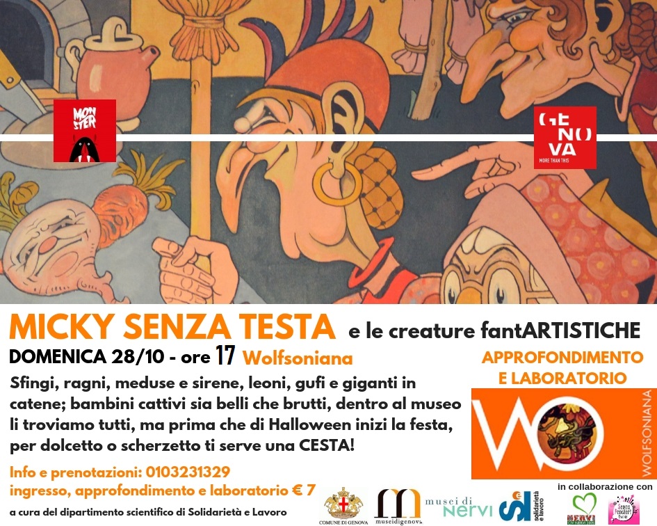 A fine visita, si svolgerà un’attività di laboratorio per la costruzione di un cestino artistico, decorato con gli animali mostruosi incontrati durante il percorso, che potrà essere utilizzato per raccogliere dolcetti all’Halloween Party del 31 Ottobre organizzato dal CIV NERVI2005 presso Campetto San Siro alle ore 16.30.