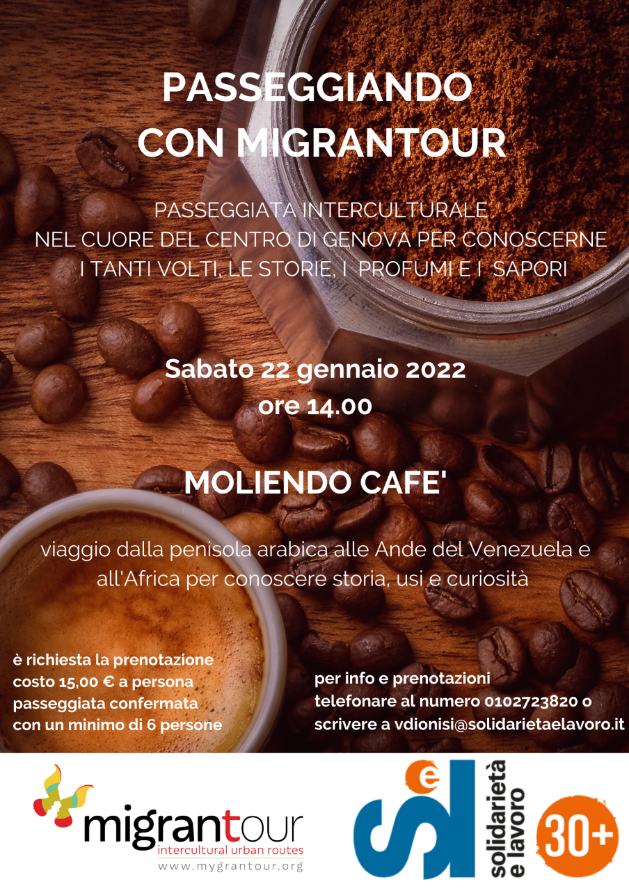 Novità in arrivo nell’ambito del ciclo di passeggiate interculturali “Passeggiando con Migrantour”, che propone percorsi sempre diversi, per conoscere i tanti volti del Centro Storico di Genova e che svela culture, sapori e tradizioni che provengono da ogni parte del mondo. “Moliendo café”, un percorso che si snoda tra Principe e Via San Luca, alla scoperta del mondo variegato e affascinante legato al Caffè, in un “viaggio” dalla penisola arabica alle Ande del Venezuela e all’Africa per conoscere storia, usi e curiosità di questa bevanda tanto apprezzata.