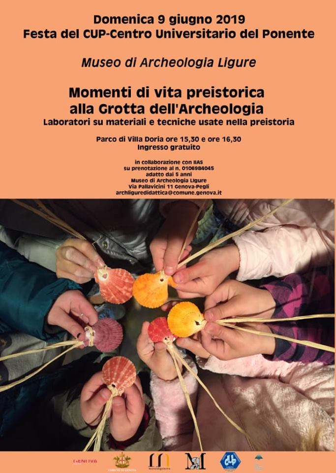 Domenica 9 giugno a partire dalle ore 15.30, in occassione dei 20 anni di attività del Centro Universitario Ponente (CUP), il Museo di Archeologia Ligure di Genova organizza momenti di vita preistorica per le famiglie alla Grotta dell'Archeologia nel parco di Villa Doria (Pegli), per sperimentare materie prime e techiche utilizzate nelle grotte della Liguria 6000 anni fa.