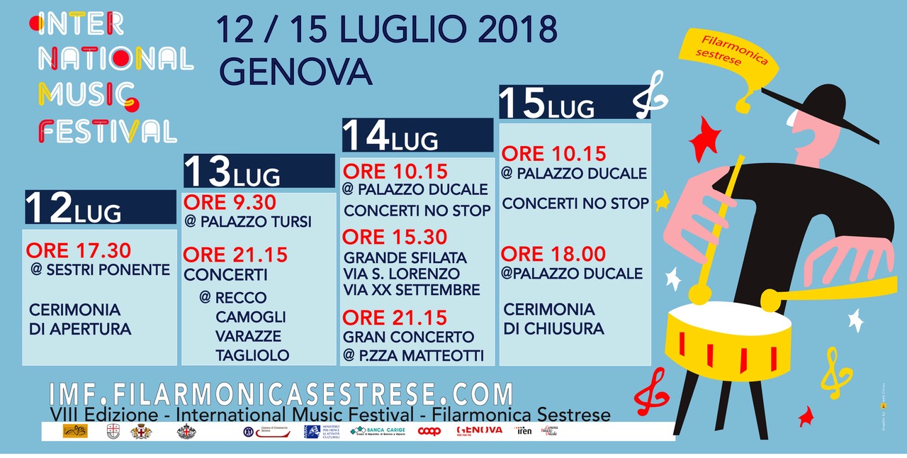 Torna International Music Festival, evento a livello internazionale e a cadenza biennale organizzato dalla Filarmonica Sestrese. La rassegna, quest’anno alla sua VIII edizione, da giovedì 12 a domenica 15 luglio trasformerà Genova in un grande palcoscenico, con un cartellone di concerti, performance e sfilate.Alle passate edizioni del Festival, che dal 2004 riscuote un grande successo nella nostra città, hanno partecipato gruppi provenienti da tutto il mondo: Finlandia, Francia, Inghilterra, Repubblica Ceca, Estonia, Bulgaria, Spagna, Portogallo, Ungheria, Germania, Svizzera, Scozia, Danimarca, Israele, Russia e Stati Uniti.L'evento è parte della rassegna 'Genova Città dei Festival', organizzata in collaborazione con il Comune di Genova. Sponsor dell'iniziativa: Gruppo Iren, Coop Liguria.