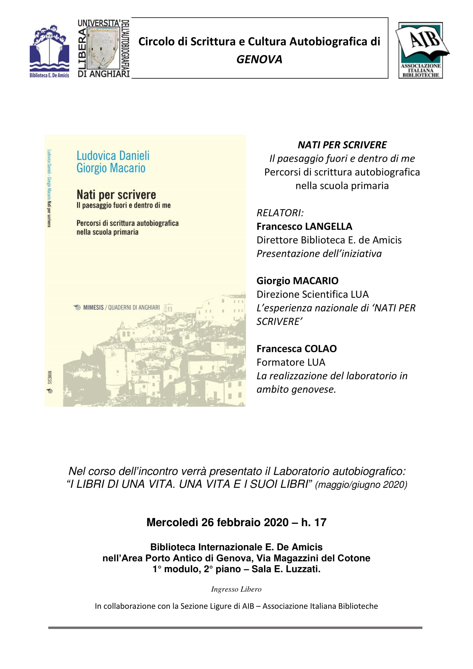 relatori: Francesco Langella, presidente AIB Liguria e responsabile scientifico della biblioteca - Presentazione dell'iniziativa