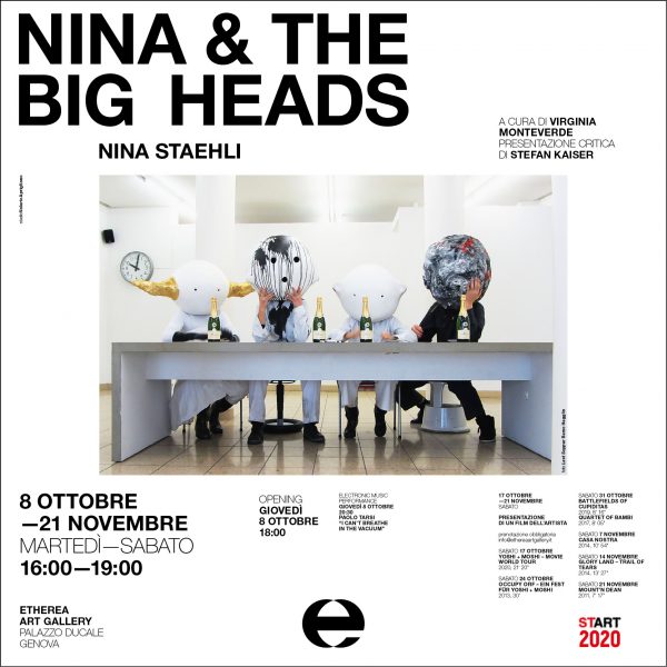Da giovedì 8 ottobre, Etherea Art Gallery riprende l’attività espositiva e lo fa in occasione della ripartenza di START, la notte bianca delle gallerie genovesi. Ad aprire la stagione 2020/2021 di Etherea Art Gallery è l’artista svizzera Nina Staehli con la mostra Nina & the Big Heads, a cura di Virginia Monteverde con la presentazione critica di Stefan Kaiser.