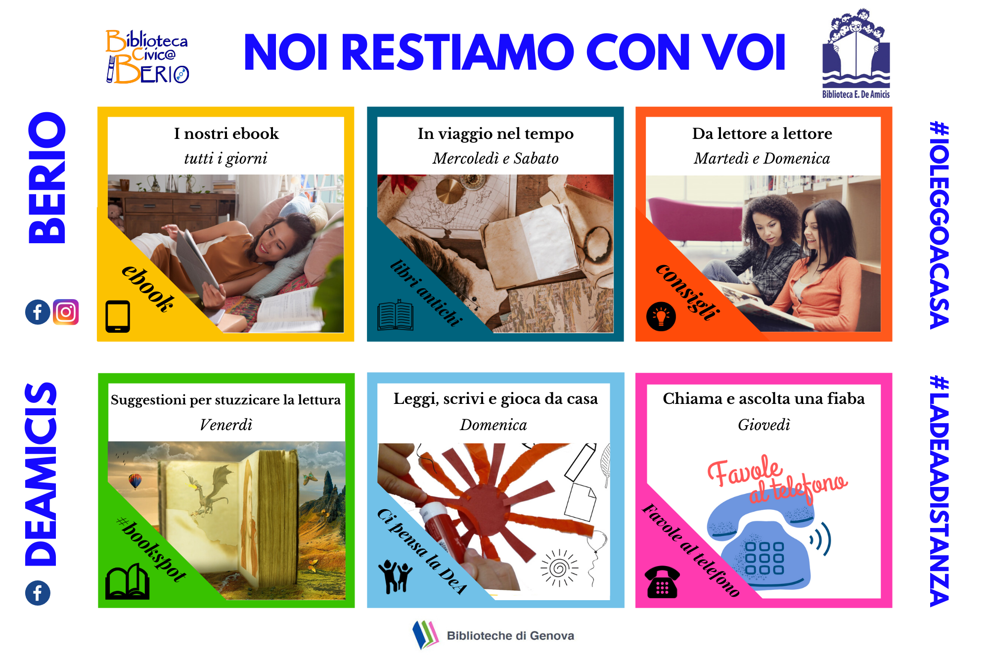 In questi giorni di forzata lontananza, le biblioteche Berio e De Amicis rimangono vicine ai loro lettori “a distanza”, sempre virtualmente aperte attraverso il Portale informativo, le pagine social ricche di nuove rubriche e attraverso la biblioteca digitale, che consente di scaricare risorse per tutti