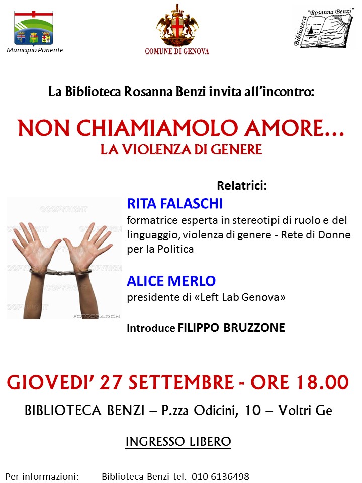 Relazione a cura di R. Falaschi, esperta in stereotipi di ruolo e linguaggio e A. Merlo presidente di "Left Lab Genova", sulla violenza di genere. Seguirà dibattito con il pubblico.