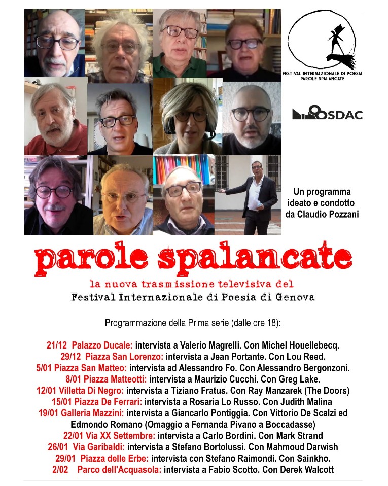 Ogni puntata di Parole spalancate, prodotto in collaborazione con SDAC – Scuola d’Arte Cinematografica, prevede un’intervista a distanza con un poeta italiano partendo da luoghi-chiave del Centro storico di Genova e una “gemma” del ricchissimo archivio video del Festival, che in 26 edizioni ha ospitato oltre 1700 poeti e artisti da 89 Paesi mondiali.