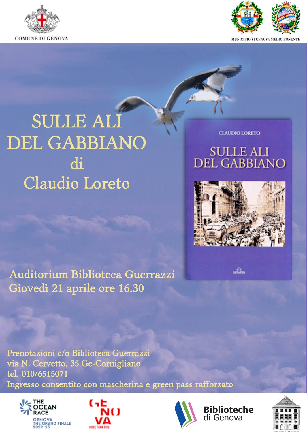 Sarà presentato il libro "Sulle ali del gabbiano", ambientato a Genova, durante la II Guerra Mondiale. Il libro tratta i temi dell’amore e dell’amicizia. La fraterna amicizia che lega Amedeo e Dario si spezza quando Viola, abbandonata dal primo poiché si arruola volontario, finisce con il ricambiare il sentimento nel frattempo sbocciato nell'altro. Le vicende belliche seguite all'armistizio risucchiano inoltre i due giovani in schieramenti opposti, rispettivamente nella "X MAS" e nella formazione partigiana "Cichero" guidata da Aldo Gastaldi "Bisagno". In una spirale di odio, Dario e Amedeo si daranno caccia a vicenda per uccidersi. Il destino ha però in serbo per loro un diverso epilogo, amaro e purificatore insieme. Una storia di straordinaria amicizia e di amore giovanile, dentro la cornice di una città martoriata dai bombardamenti e dalla ferocia dell'occupante nazista.