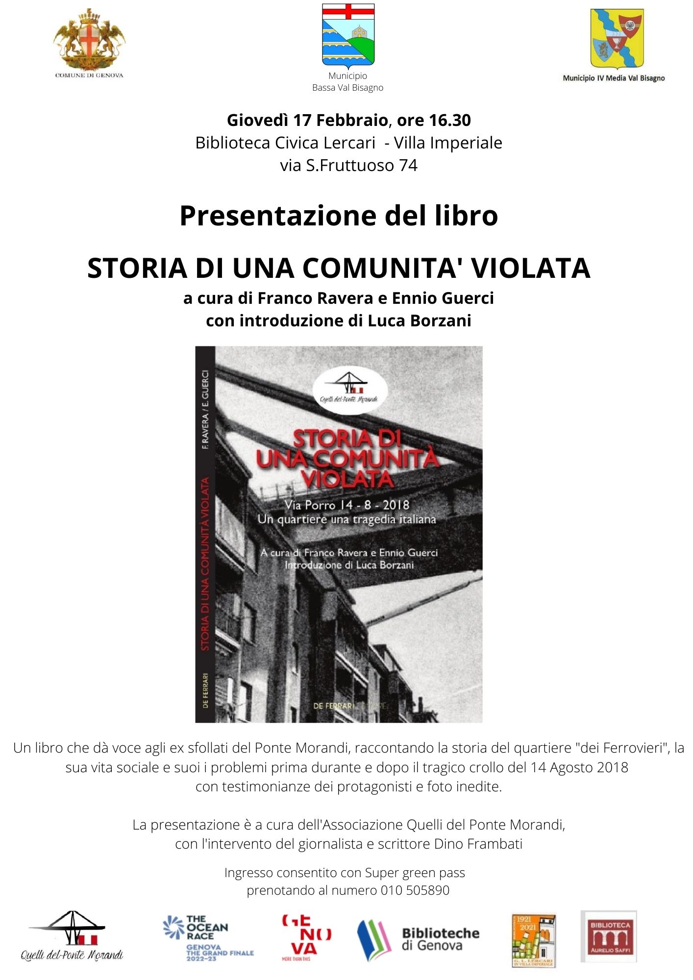 L’associazione "Quelli del Ponte Morandi" presenterà il libro redatto dagli ex sfollati del Ponte Morandi che racconta la storia del quartiere “dei Ferrovieri”, la sua vita sociale, i problemi prima durante e dopo il tragico crollo del 14 agosto 2018 con testimonianze dei protagonisti e foto inedite.