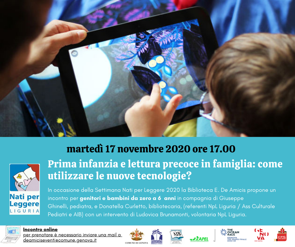 In occasione della Settimana Nati per Leggere 2020 la Biblioteca E. De Amicis propone un incontro per genitori di bambini da zero a 6 anni in compagnia di Giuseppe Ghinelli, pediatra, e Donatella Curletto, bibliotecaria, (referenti NpL Liguria / Ass Culturale Pediatri e AIB) con un intervento di Ludovica Brunamonti, volontaria NpL Liguria.