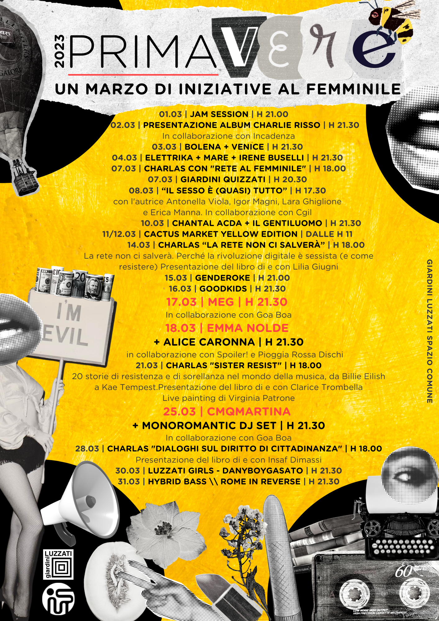Dal 1 al 31 marzo si terrà la seconda edizione di PRIMAVERE, un mese dedicato a musica, arte, spettacoli e incontri culturali declinati al femminile, nella cornice dei Giardini Luzzati, proprio a due passi dalla piazza intitolata a Teresa Mattei, partigiana, resistente e donna della Costituzione.