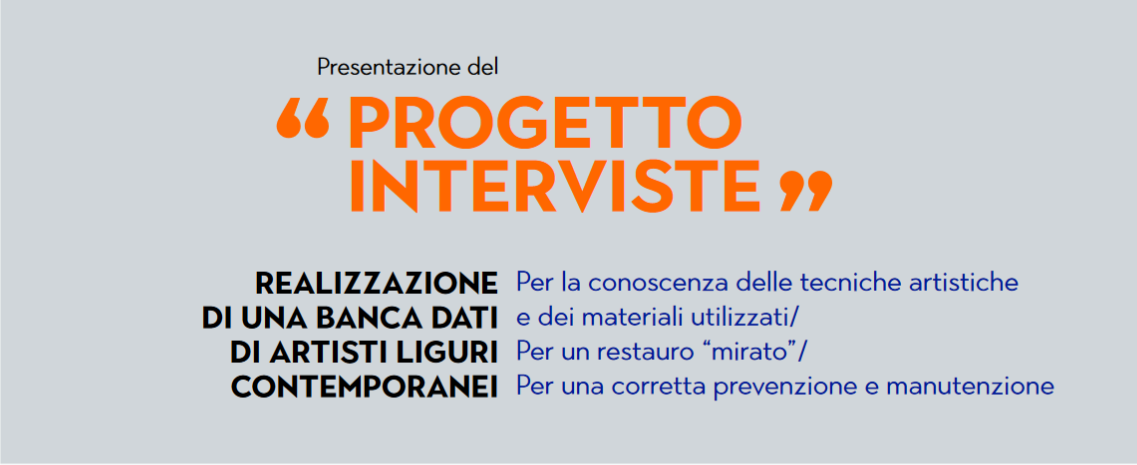 Il Progetto interviste - realizzazione di una banca dati di artisti liguri contemporanei- nasce con lo scopo di riunire il maggior numero di dati presso gli artisti riguardanti le loro tecniche espressive ed i materiali adoperati nel corso della loro carriera e prevedere le condizioni migliori di presentazione e conservazione delle opere nonché le condizioni poste dall’artista per eventuali interventi, creando un fondo di dati informatizzati per facilitare l'accesso alle informazioni raccolte.