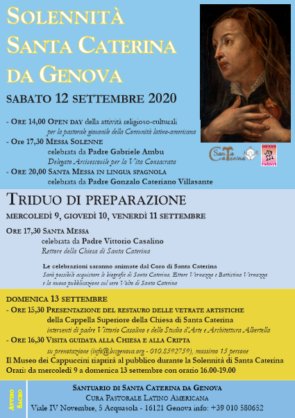 In occasione della Solennità di santa Caterina da Genova, il Museo e la Cappella Superiore della Chiesa (Auditorium) tornano visitabili da mercoledì 9 a domenica 13 settembre con orario dalle 16,00 alle 19,00.