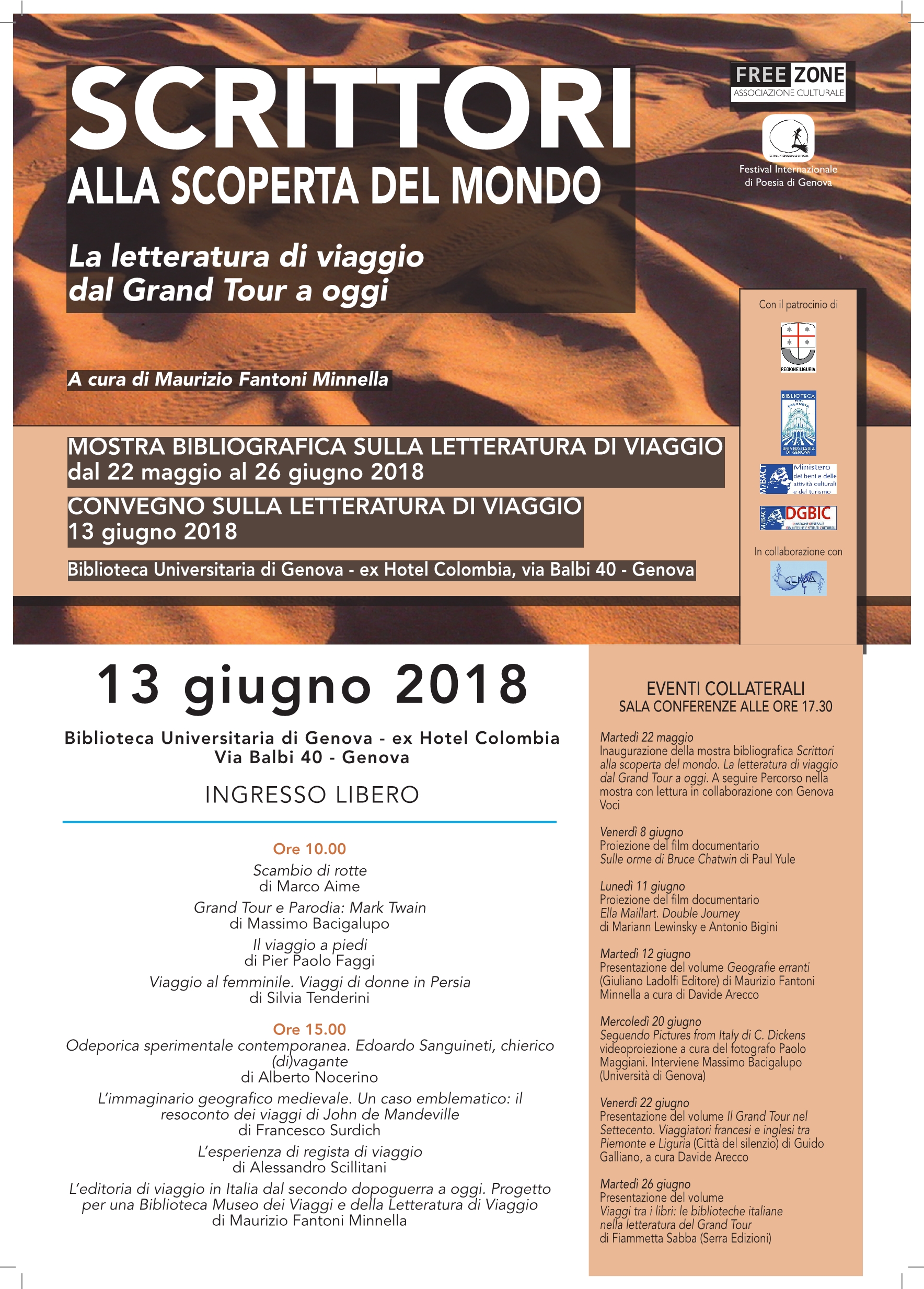 Dal 22 maggio al 26 giugno 2018 si terrà presso Biblioteca Universitaria di Genova, una mostra bibliografica Scrittori alla scoperta del mondo.Inaugurazione mostra: 22 maggio, ore 17.30 a cura di Maurizio Fantoni Minnella. A seguire Percorso nella mostra con lettura in collaborazione con Genova VociA lato e coronamento della mostra si svolgerà una serie di eventi che verranno segnalati di volta in volta nell'home page del sito della biblioteca.Il 13 giugno un convegno sulla letteratura di viaggio seguirà alla mostra, entrambi sono organizzati nell’ambito di Poevisioni, la sezione cinematografica e letteraria del Festival Internazionale di Poesia, diretta da Maurizio Fantoni Minnella. La mostra rimarrà aperta fino a martedì 26 giugno 2018. La mostra è divisa in nove sezioni:- Grand Tour negli autori classici- Sezione tra le due guerre- Grand Tour nel Novecento- Viaggiare al femminile- Viaggi a piedi- Teoria del viaggio- Viaggiatori stranieri e italiani nel mondo- Baedeker- Viaggio e poesia- CartografiaOrari: lunedì - venerdì dalle 09.00 alle 19.00 e il sabato mattina delle 09.00 alle 13.00Ingresso libero