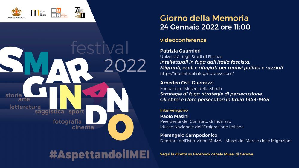 Smarginando ricordando le date importanti come il Giorno della Memoria, 27 gennaio 1945, in cui furono abbattuti i cancelli di Auschwitz e la parola “dignità” che il Novecento ha calpestato. E' impossibile ripensare senza orrore a quanto avvenne pochi decenni fa nel cuore dell'Europa: lo sterminio di milioni di persone. Per onorare il Giorno della Memoria il 24 gennaio 2022 alle ore 11:00, al Galata Museo, online sul canale Facebook dei Musei di Genova, che avrà al centro due temi fondamentali per il MEI: "Intellettuali in fuga dall'Italia fascista – Migranti esuli e rifugiati per motivi politici e razziali" con Patrizia Guarnieri, Università di Firenze e “Strategie di fuga, strategie di persecuzione - Gli ebrei e i loro persecutori in Italia 1943 – 1945” con Amedeo Osti Guerrazzi, Fondazione Museo della Shoah. Interverranno Paolo Masini Presidente del Comitato di Indirizzo Museo Nazionale dell’Emigrazione Italiana e Pierangelo Campodonico Direttore dell’Istituzione MuMA – Musei del Mare e delle Migrazioni. Un'iniziativa che sarà anche un'occasione per riflettere sulla necessità di imparare a fare memoria, una sfida del presente e del futuro di questo nostro tempo.