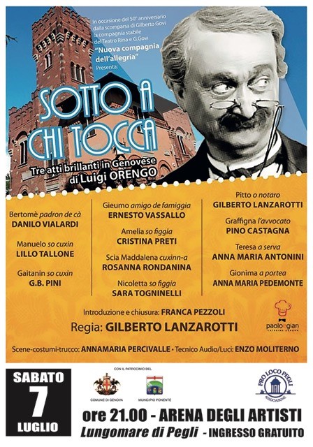 A 50 anni dalla scomparsa del grande Gilberto Govi, la compagnia stabile del Teatro Rina e G. Govi "Nuova compagnia dell'allegria" mette in scena "Sotto a chi tocca", tre atti brillanti in genovese di Luigi Orengo per la regia di Gilberto Lanzarotti.Appuntamento sabato 7 luglio alle 21 all'Arena degli artisti sul lungomare di Pegli.Ingresso gratuito Di seguito la locandina con gli interpreti: