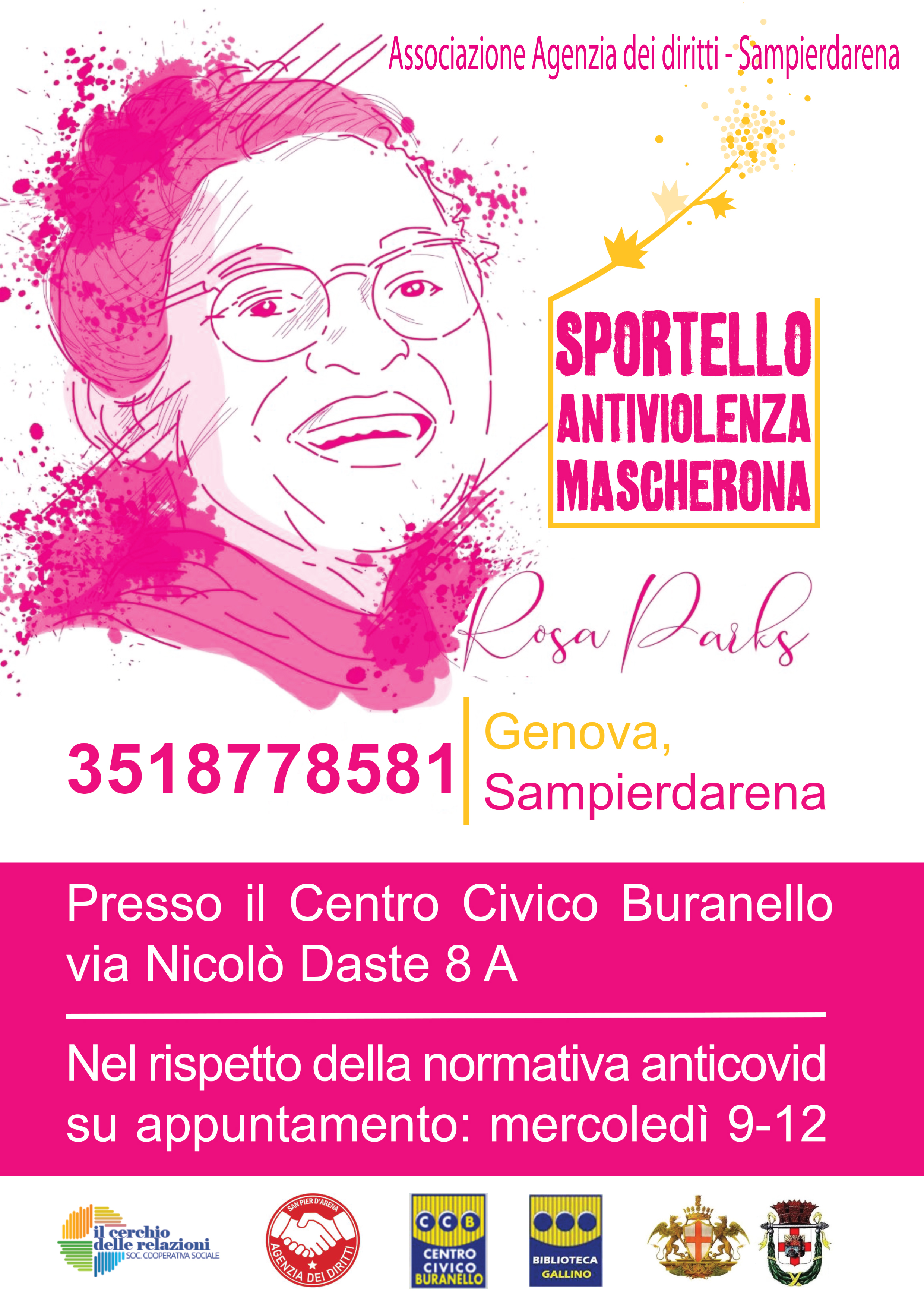 Da mercoledì 19 maggio è attivo, presso il CCBur/Biblioteca Gallino, lo Sportello Antiviolenza Mascherona gestito dall’Associazione Agenzia dei Diritti, firmataria del Patto per la Cultura a Sampierdarena.