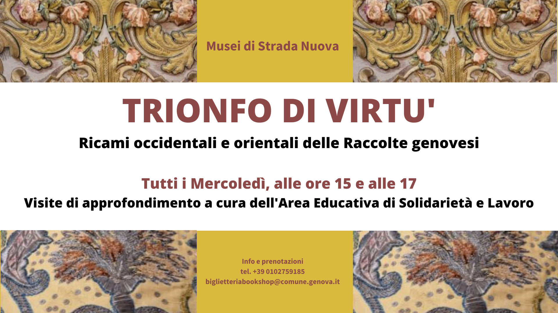 Inaugurate in occasione delle Giornate Europee del Patrimonio, prendono il via, tutti i Mercoledì, alle ore 15 e alle 17, le visite accompagnate alla mostra "Trionfo di virtù" - Ricami occidentali e orientali delle Raccolte genovesi, a cura dell’Area Educativa della Cooperativa Solidarietà e Lavoro scs-onlus.