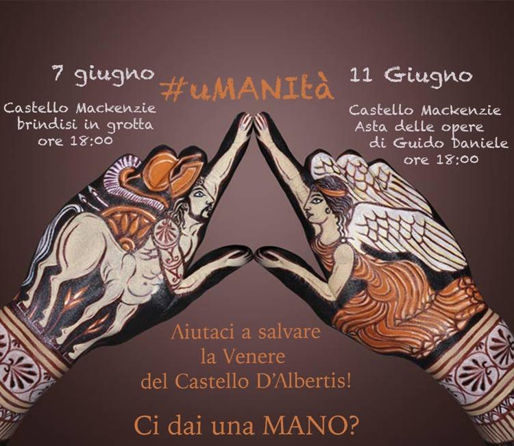 venerdì 7 giugno, ore 18: Cocktail di inizio esposizione delle tele, offerto da Bon Ton Bistrot, alla presenza dell'artista, che firmerà il volume con le sue opere, dinnanzi alla Venere nelle suggestive grotte di Castello Mackenzie.