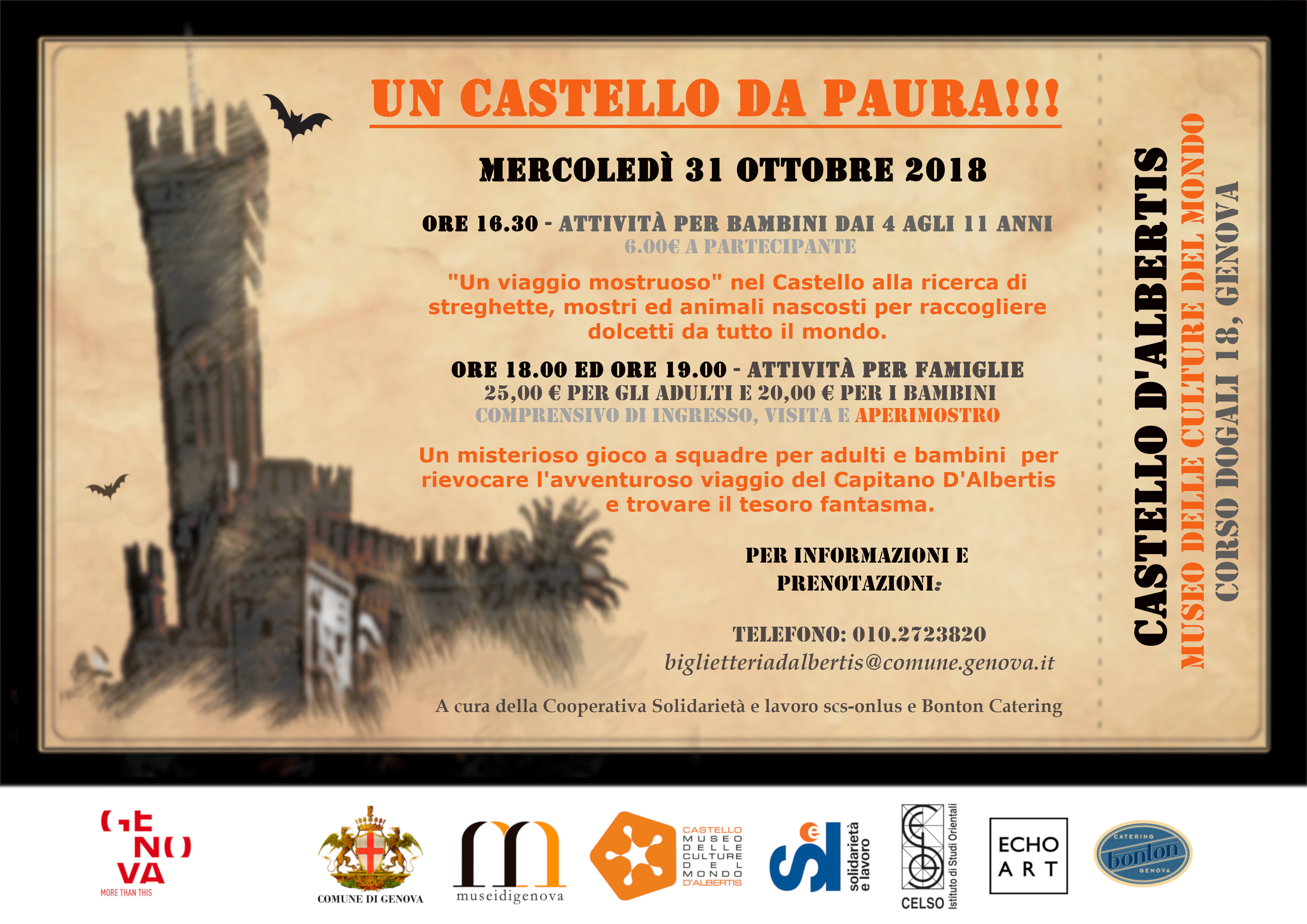 La prima attività consiste in "un viaggio mostruoso" alla scoperta dei misteri che si celano nel Castello alla ricerca di mostri, streghette e animali nascosti fra le collezioni del Capitano D'Albertis, per raccogliere infine dolcetti da tutto il mondo.