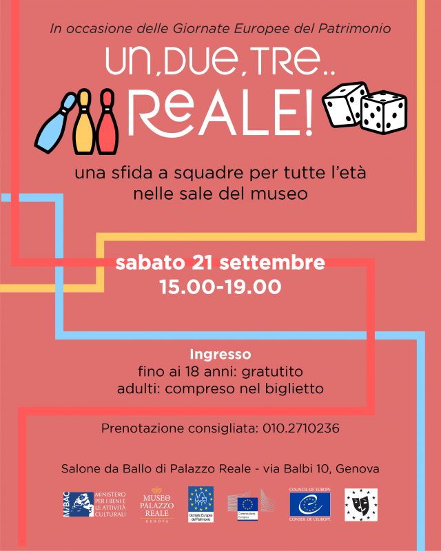 Sabato 21 settembre, dalle ore 15.00 alle 19.00, il Museo di Palazzo Reale propone "Un, due, tre... Reale!", un pomeriggio di gioco in museo, che permetterà di scoprire le bellezze delle collezioni divertendosi. Una sfida a squadre per tutte le età nelle sale del Museo, che segue il tema prescelto per questa edizione delle Giornate Europee del Patrimonio – ovvero “Un due tre…Arte! Cultura e intrattenimento”.