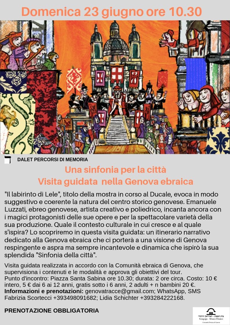 "Il labirinto di Lele", titolo della mostra in corso al Ducale, evoca in modo suggestivo e coerente la natura del centro storico genovese. Emanuele Luzzati, ebreo genovese, artista creativo e poliedrico, incanta ancora con i magici protagonisti delle sue opere e per la spettacolare varietà della sua produzione. Quale il contesto culturale in cui cresce e al quale s'ispira? Lo si potrà scoprire in questa visita guidata: un itinerario narrativo dedicato alla Genova ebraica e che condurrà a quella visione di Genova respingente e aspra, ma sempre incantevole e dinamica che ispirò la sua splendida "Sinfonia della città". La visita guidata è realizzata in accordo con la Comunità ebraica di Genova, che supervisiona i contenuti e le modalità e approva gli obiettivi del tour.