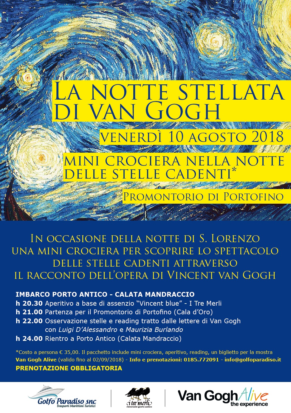 Venerdì 10 agosto, in occasione della Notte di San Lorenzo, a partire dalle ore 20.30 la mostra "Van Gogh Alive - The Experience" di Genova propone La Notte Stellata di Van Gogh, una mini crociera dal Porto Antico al promontorio di Portofino per scoprire lo spettacolo delle stelle cadenti attraverso la lettura delle parole del maestro olandese.