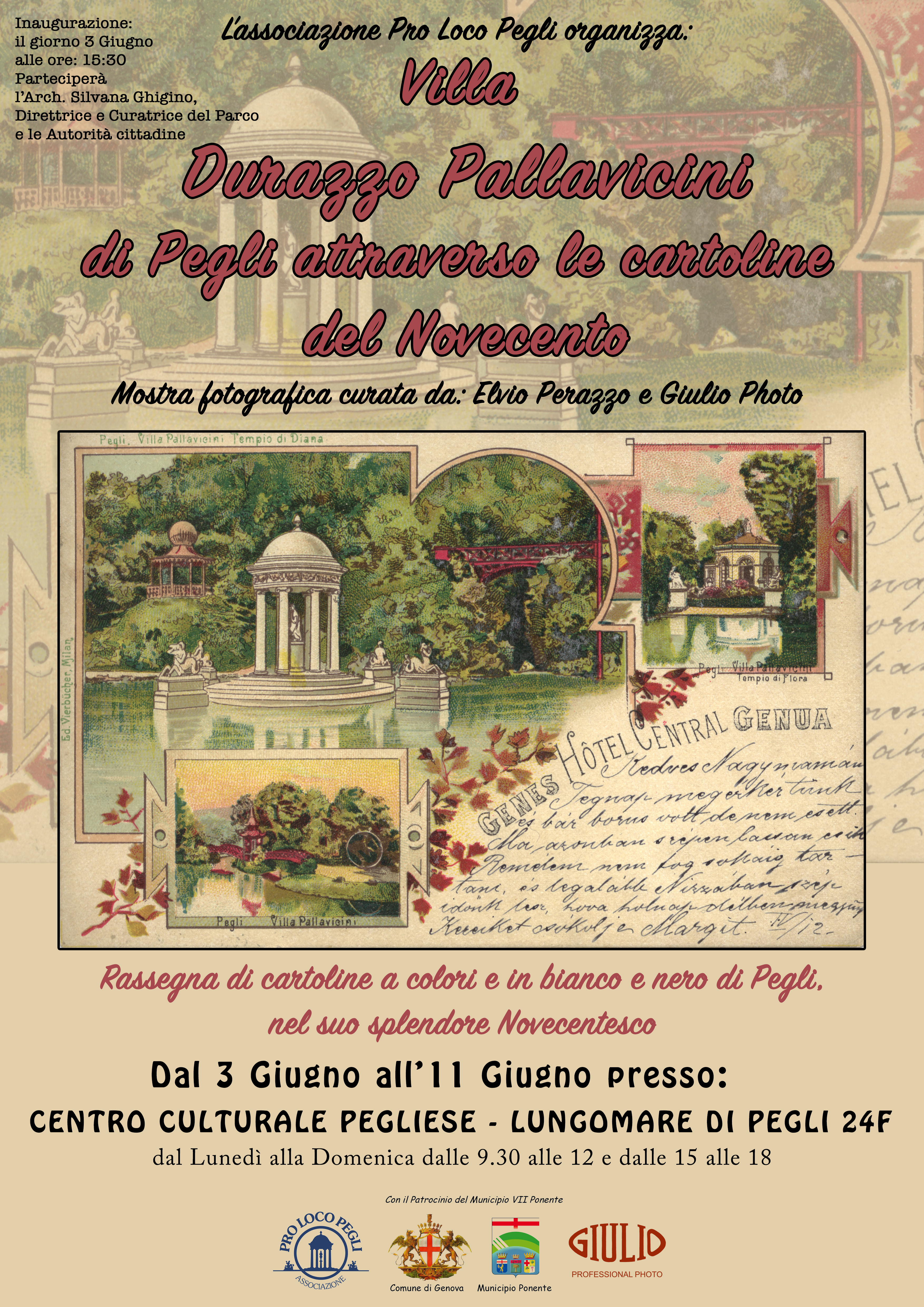 La mostra fotografica "Villa Durazzo Pallavicini di Pegli attraverso le cartoline del Novecento" è in esposizione dal 3 giugno all'11 giugno nel Centro Culturale Pegliese, lungomare di Pegli 24F.