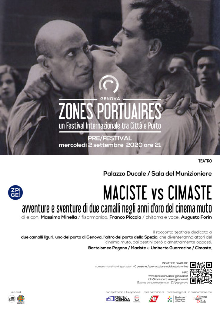 In occasione del prefestival di Zones Portuaires mercoledì 2 settembre alle 21.00 la Sala del Munizioniere di Palazzo Ducale ospita l’anteprima di "Maciste vs Cimaste", lo spettacolo teatrale dello scrittore e giornalista Massimo Minella. Insieme all’autore ci sono Franco Piccolo fisarmonica e Augusto Forin, chitarra e voce. È la storia di due camalli diventati attori del cinema muto ma dai destini diametralmente opposti. E’ un tuffo nel passato con legami e storie unici e sorprendenti.