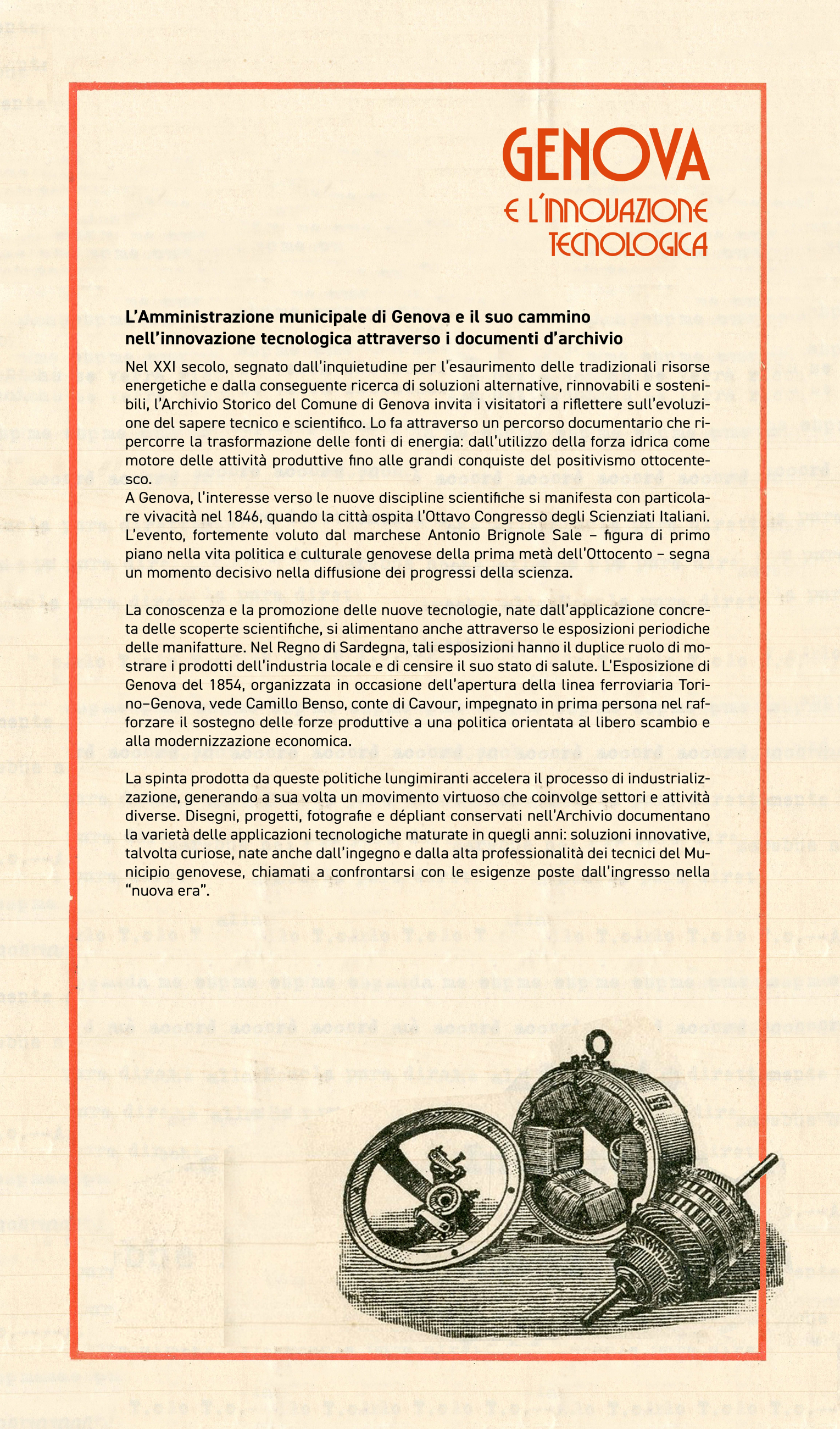Nel XXI secolo, segnato dall’inquietudine per l’esaurimento delle tradizionali risorse energetiche e dalla conseguente ricerca di soluzioni alternative, rinnovabili e sostenibili, l’Archivio Storico del Comune di Genova invita i visitatori a riflettere sull’evoluzione del sapere tecnico e scientifico. Lo fa attraverso un percorso documentario che ripercorre la trasformazione delle fonti di energia: dall’utilizzo della forza idrica come motore delle attività produttive fino alle grandi conquiste del positivismo ottocentesco. A Genova, l’interesse verso le nuove discipline scientifiche si manifesta con particolare vivacità nel 1846, quando la città ospita l’Ottavo Congresso degliScienziati Italiani. L’evento, fortemente voluto dal marchese Antonio Brignole Sale, figura di primo piano nella vita politica e culturale genovese della prima metà dell’Ottocento, segna un momento decisivo nella diffusione dei progressi della scienza. La conoscenza e la promozione delle nuove tecnologie, nate dall’applicazione concreta delle scoperte scientifiche, si alimentano anche attraverso le esposizioni periodiche delle manifatture. Nel Regno di Sardegna, tali esposizioni hanno il duplice ruolo di mostrare i prodotti dell’industria locale e di censire il suo stato di salute.