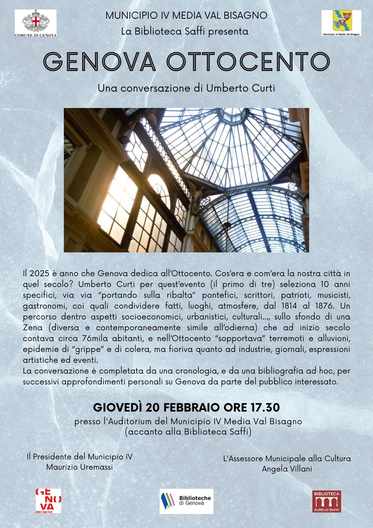 Il 2025 è anno che Genova dedica all’Ottocento, per indagare momenti di storia cittadina con peculiari ricerche ed iniziative, e per comprendere sempre meglio le diacronie, l’identità e finanche le vocazioni di una città-porto “superba”. Cos’era e com’era la nostra città in quel secolo? Umberto Curti per quest’evento (il primo di tre) seleziona 10 anni specifici, via via “portando sulla ribalta” pontefici, scrittori, patrioti, musicisti, gastronomi, coi quali condividere fatti, luoghi, atmosfere, dal 1814 al 1876. Un percorso dentro aspetti socioeconomici, urbanistici, culturali…, sullo sfondo di una Zena (diversa e contemporaneamente simile all’odierna) che ad inizio secolo contava circa 76mila abitanti, e nell’Ottocento “sopportava” terremoti e alluvioni, epidemie di “grippe” e di colera, ma fioriva quanto ad industrie, giornali, espressioni artistiche ed eventi. La conversazione è completata da una cronologia, e da una bibliografia ad hoc, per successivi approfondimenti personali su Genova da parte del pubblico interessato.