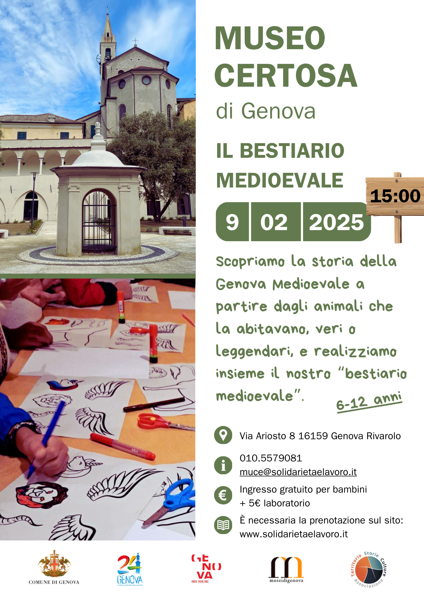 Il MUCE-Museo Certosa di Genova propone “Il Bestiario Medioevale”, speciale laboratorio ludico-didattico rivolto a bambini/e dai 6 ai 12 anni, in cui si vanno a scoprire tutti gli animali che abitavano la Genova Medioevale.