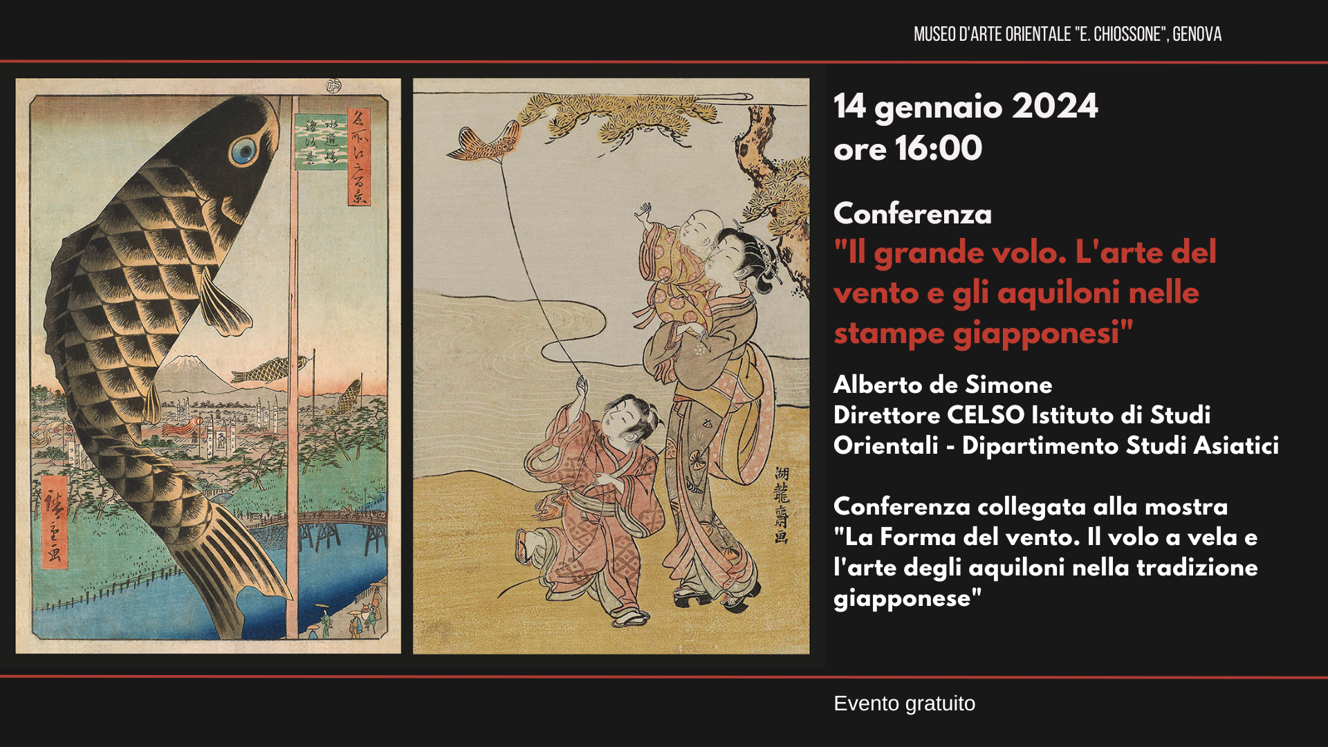 Il Museo d’arte orientale Edoardo Chiossone invita domenica 14 gennaio 2024 alle ore 16.00 alla Conferenza “Il grande volo. L'arte del vento e gli aquiloni nelle stampe giapponesi" durante la quale è possibile approfondire la dimensione cerimoniale dell’aquilone, l'eleganza del volo, il filo sottile che unisce il cielo e la terra, la cultura del simbolo e l'amplificazione della bellezza, l'universo degli attori e delle scene del teatro Kabuki, nonché il rapporto con la natura e le scenografie dei paesaggi, con Alberto de Simone (Direttore CELSO Istituto di Studi Orientali - Dipartimento Studi Asiatici) .