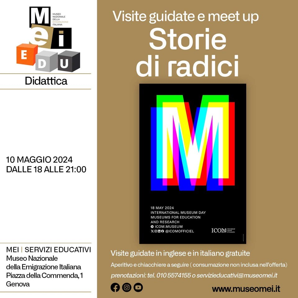 In occasione della Giornata Internazionale dei Musei 2024 istituita da ICOM e per celebrare l’anno del turismo delle radici, il Museo Nazionale dell’Emigrazione Italiana è felice di presentare l’evento Storie di radici. Dopo una visita guidata all’interno del MEI per scoprire le storie e le ragioni che in 160 anni hanno portato milioni di italiani in tutto il mondo, a mettervi in gioco siete voi: seduti intorno a un tavolo del bar dell’Ostello Bello di Genova, vi viene chiesto di condividere parole, musiche e ricette che raccontino le vostre radici, siano esse dall’altra parte del mondo, d’Italia o a pochi metri da Genova.