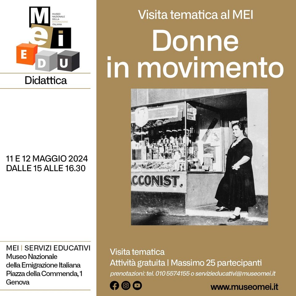 Attività per adulti: “Donne in movimento”, visita guidata alla scoperta delle storie di emigrazione femminile narrate nel museo. La prenotazione è consigliata e può essere effettuata fino alle ore 18:00 del giorno prima dell’evento. Le attività gratuite della durata di circa un’ora e mezza, hanno un limite massimo di 15 partecipanti. Per prenotazioni telefonare al numero 0105574155 o scrivere a servizieducativi@museomei.it