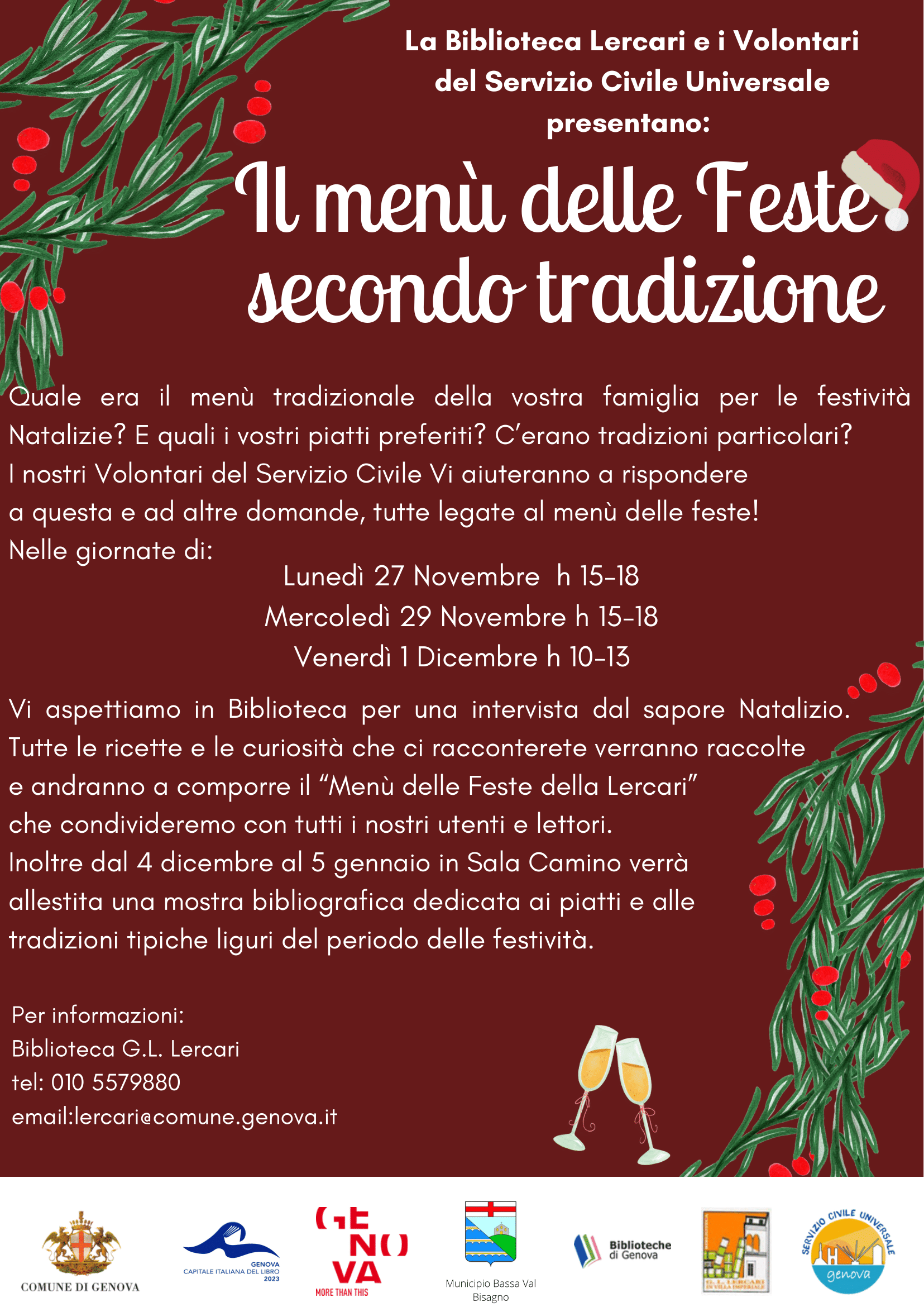 Attività organizzata in collaborazione con i Volontari del Servizio Civile Universale per andare alla scoperta e riscoperta dei menu e delle tradizioni legate al periodo delle festività. Nelle tre giornate indicate i volontari intervisteranno gli utenti che vorranno condividere le loro tradizioni legate alle festività natalizie. I materiali raccolti andranno a costituire il “Menù delle Feste della Lercari” che sarà poi condiviso con tutti i nostri lettori, sia sui social che fisicamente in biblioteca.