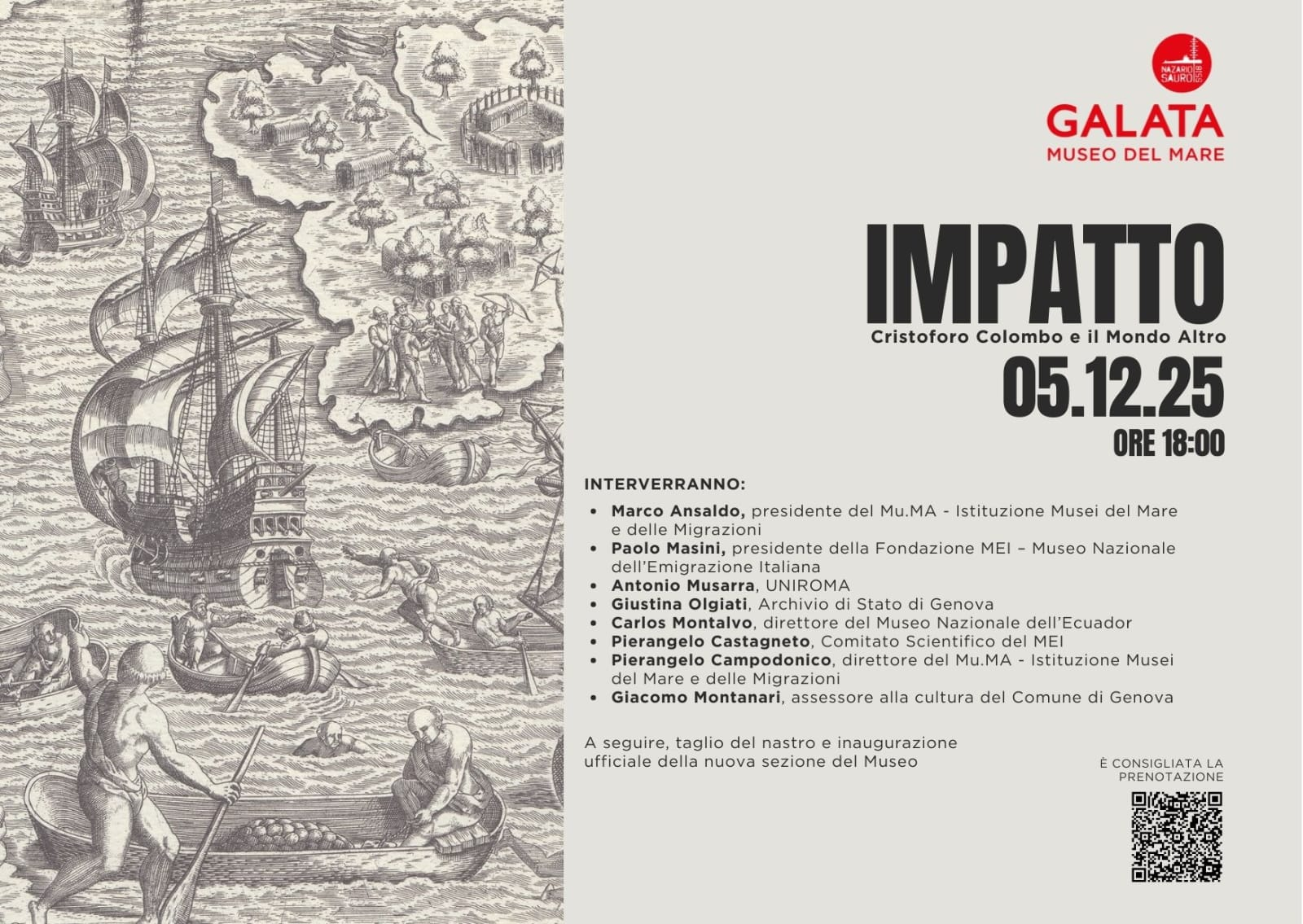 Il Galata Museo del Mare apre ufficialmente la nuova Sala Colombo, completamente riallestita con il percorso “Impatto. Cristoforo Colombo e il Mondo Altro”: una lettura innovativa della figura di Cristoforo Colombo alla luce degli studi contemporanei e delle straordinarie conseguenze che la sua impresa ebbe sulla storia delle Americhe e del mondo intero.