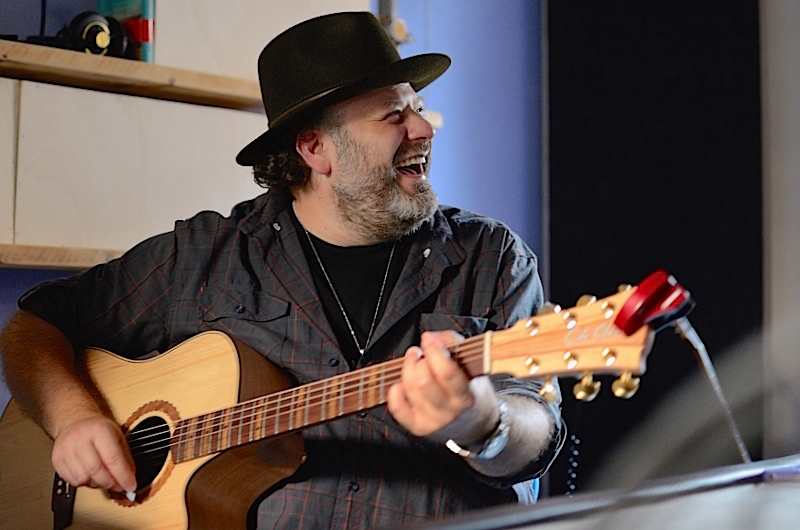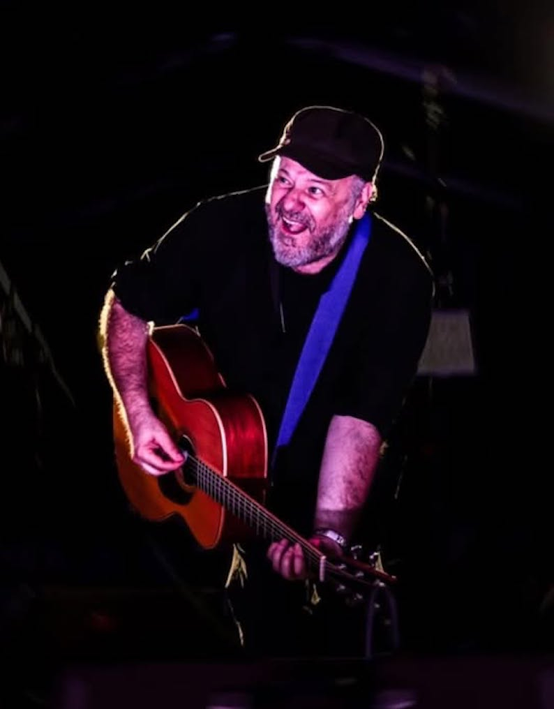 nel Teatro del Chiostro a Genova, il cantante, chitarrista e fondatore degli Yo Yo Mundi, Paolo Enrico Archetti Maestri, tiene un concerto per