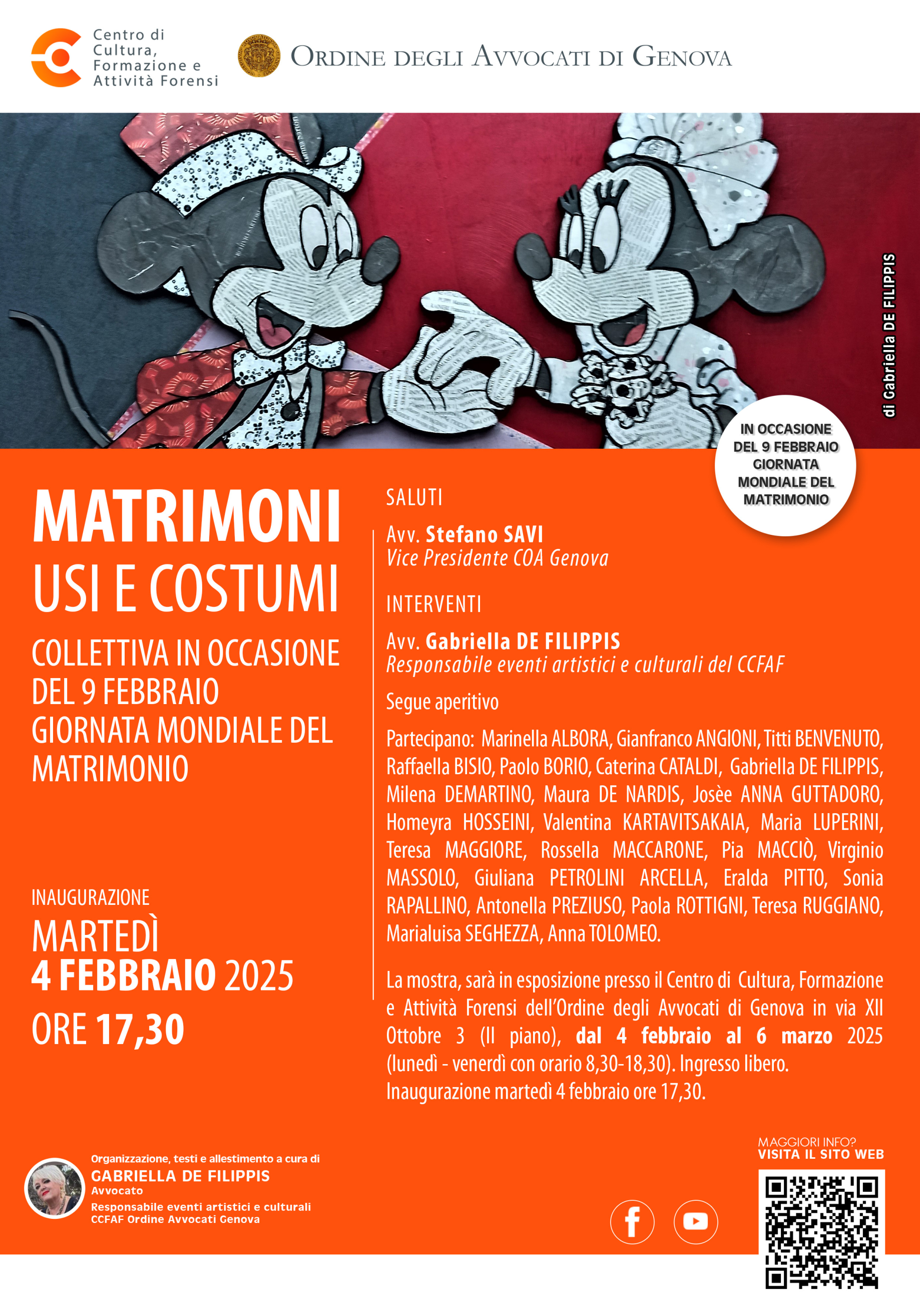In occasione del 9 febbraio, Giornata internazionale del Matrimonio, nei locali del Centro Cultura Formazione e Attività Forensi, in via XII ottobre 3, viene inaugurata la mostra dal titolo Matrimoni - usi e costumi, collettiva di arti varie alla quale hanno partecipato una trentina di artisti prevalentemente liguri.
