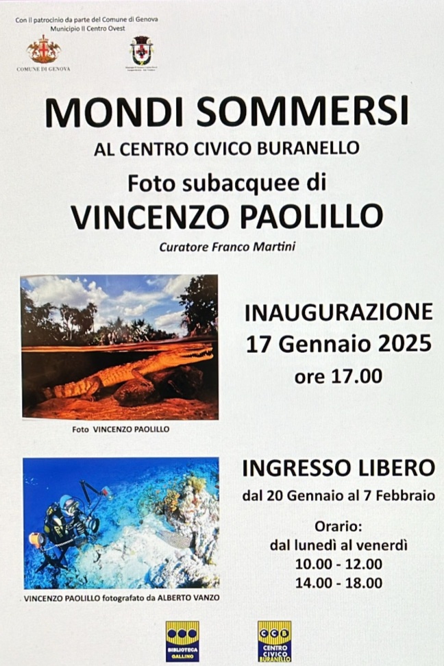 Evento patrocinato dal Municipio Centro Ovest; Raccolta di foto a tema marino che raffigurano diverse specie della fauna che popola gli ambienti subacquei, scattate dall’esperto in materia Vincenzo Paolillo, ex sub, che ci racconta le sue avventure ( e disavventure ), in giro per i fondali di tutto il mondo. Le foto sottolineano la bellezza dei tesori nascosti nei nostri mari, e la fauna multiforme e multicolore che li ospita.