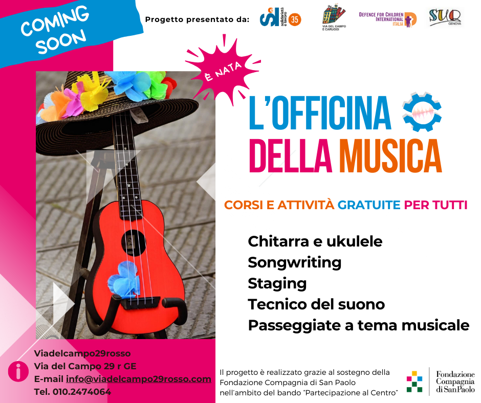 Si chiama “Officina della Musica” il progetto presentato dalla Cooperativa Solidarietà e Lavoro, che vede come partner Suq Genova Festival e Teatro, Defence for Children e Associazione Via del Campo e Caruggi nell’ambito del bando “Partecipazione al Centro” promosso da Fondazione