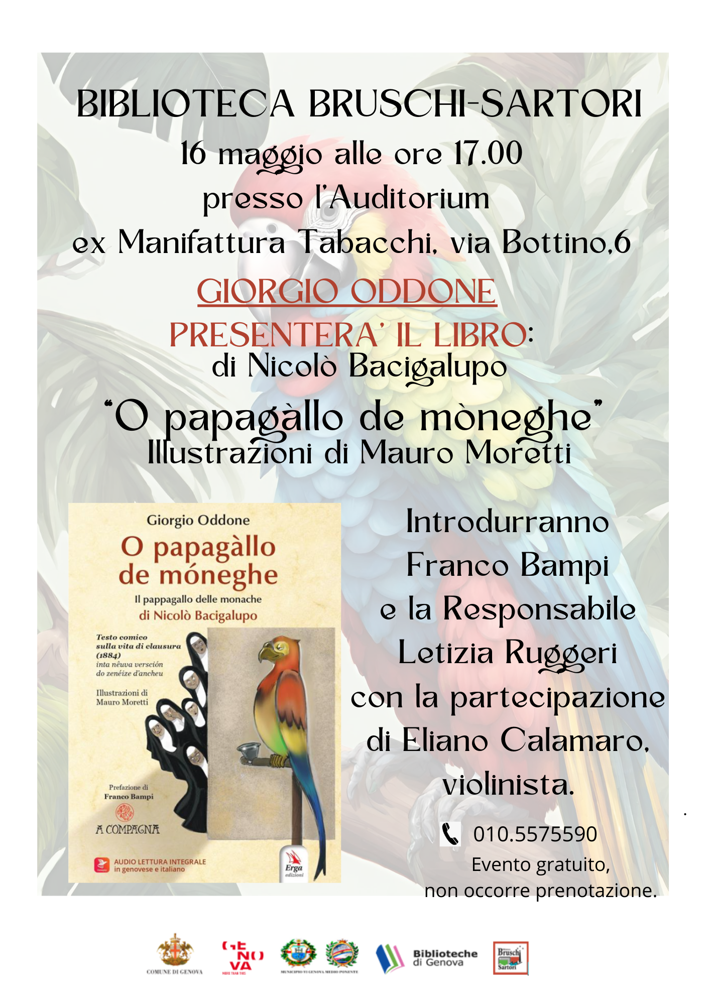 Giovedì 16 maggio alle ore 17 presso l'Auditorium ex Manifattura Tabacchi, via Bottino 6, Giorgio Oddone presenta insieme alla Responsabile della biblioteca Dott.ssa Letizia Ruggeri, il libro: “O papagàllo de móneghe”.