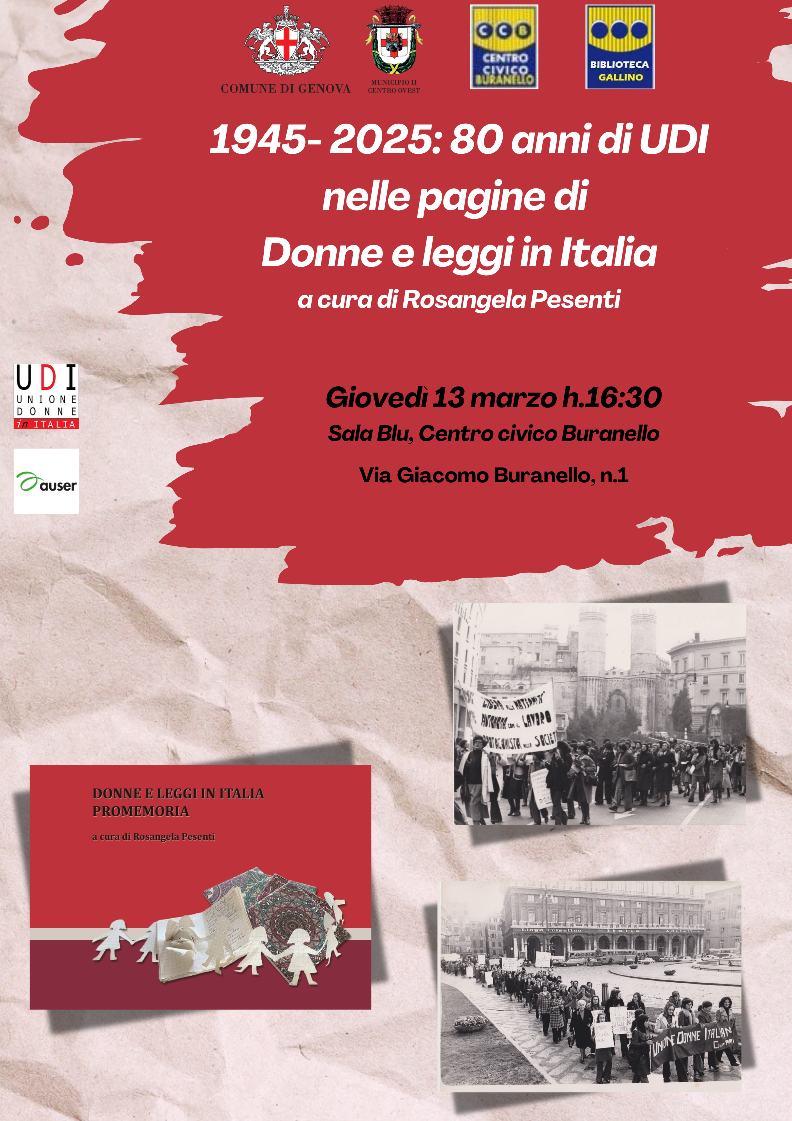 Giovedì 13 marzo alle ore 16.30 presso la Sal blu della Biblioteca Gallino, in occasione dell’ottantesimo anniversario dell’associazione Udi, discussione e dibattiti sul tema della giornata internazionale della donna.