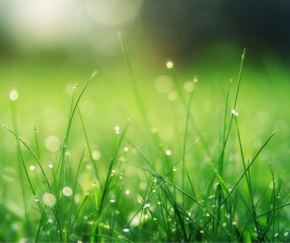 Primo piano di fili d’erba con gocce di rugiada su sfondo verde sfocato.