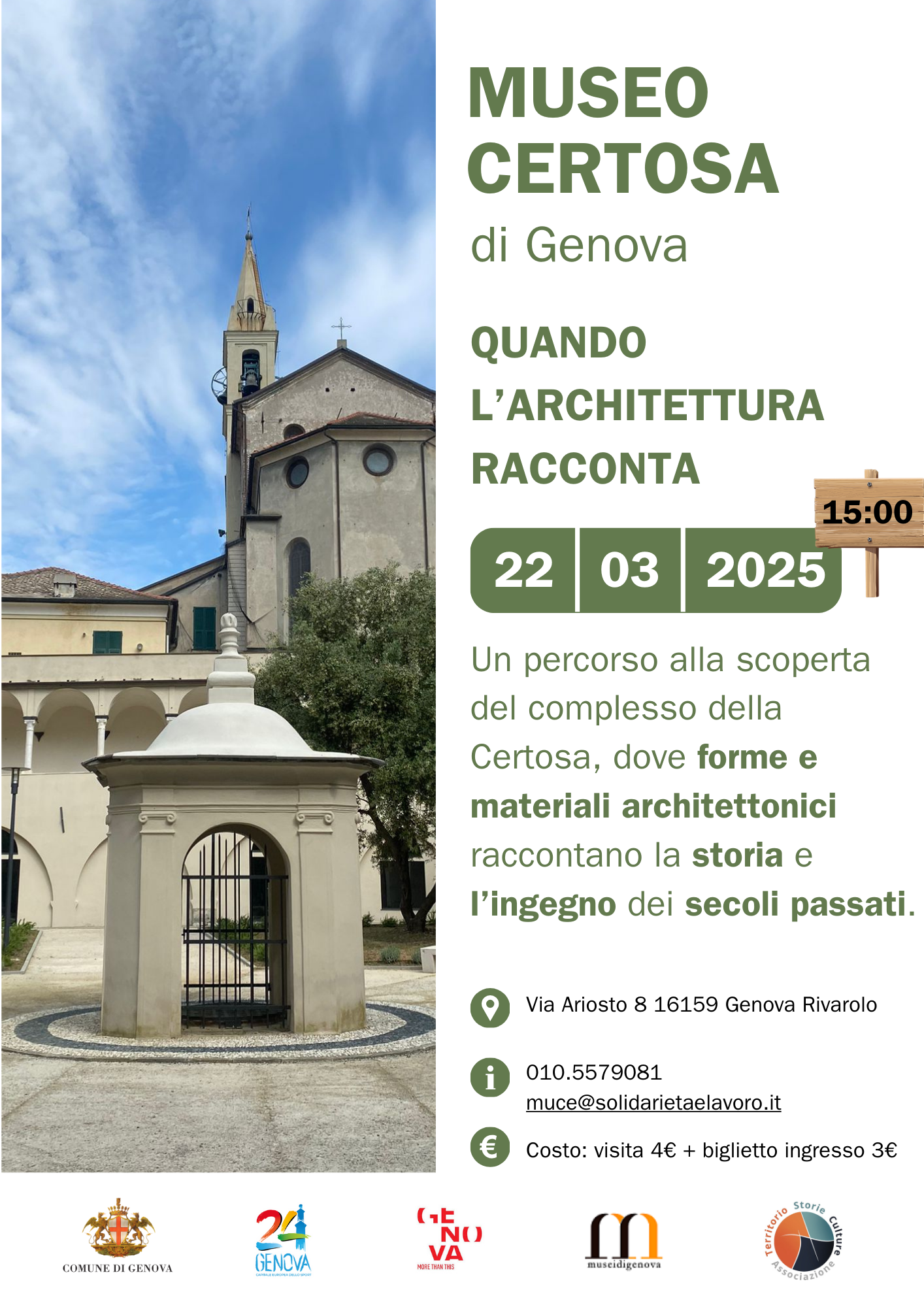 Il Museo Certosa di Genova propone una speciale visita accompagnata al complesso monumentale della Certosa, a cura del personale museale di Solidarietà e Lavoro, con un focus particolare sugli aspetti architettonici, le forme e i materiali che caratterizzano questo straordinario sito.