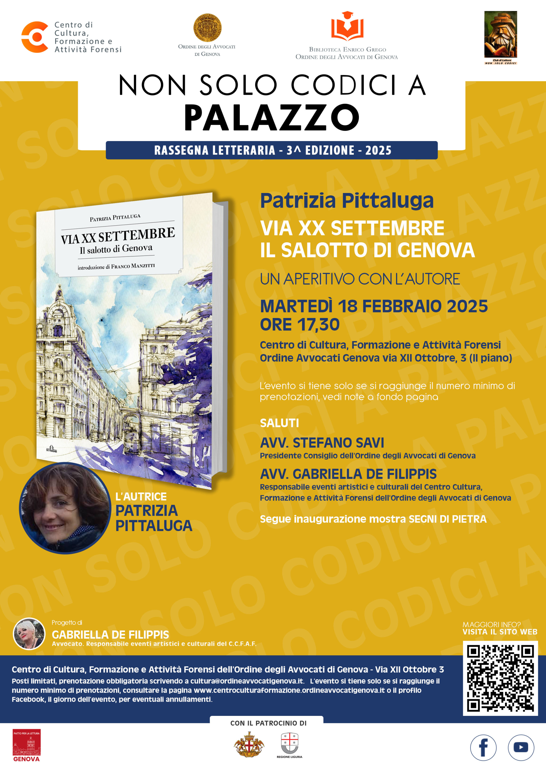 La inaugurazione di detta mostra è preceduta dalla presentazione del libro Via XX settembre-Il salotto di Genova, sempre di Patrizia Pittaluga, che nel corso della presentazione focalizza l'attenzione su quella parte della nostra città che ha determinato un cambiamento epocale, sia in termini progettuali che attuativi. Imponente è poi il cantiere che ha modificato anche topograficamente la connotazione del luogo. Ci racconta di come siano stati così realizzati palazzi innovativi, con soluzioni tecniche d’avanguardia, dotati delle più moderne tecnologie, per dare un segno tangibile della grande potenzialità di Genova., oltre alle storie di tanti professionisti, banchieri, politici che solo la determinazione di voler creare un segno e un modello ha permesso loro di superare difficoltà smisurate.