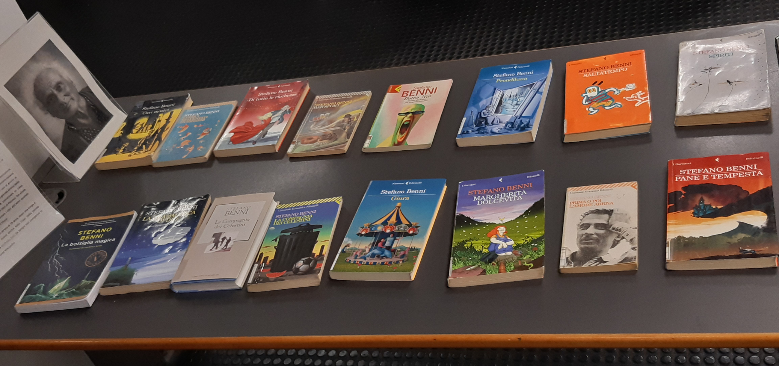 Tavolo dedicato allo scrittore bolognese, scomparso di recente, con le opere possedute dalla biblioteca Gallino.