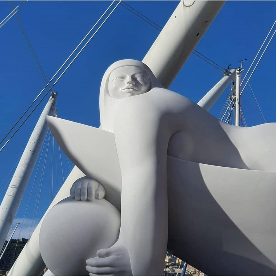 Il vostro tragitto non è ancora concluso e vi porta ora al Porto Antico, questa zona così diversa, così moderna eppure un luogo che per tutti i Genovesi ormai sa di casa da quando, nel 1992, Renzo Piano l’ha trasformata in quello che vedete oggi. Qui incontrerete prima il Viaggio, poi Incanto, quindi Rifugio: le tre sculture bianche e lucenti di un marmo pulitissimo e vibrante sotto l’aria salina del mare che le circonda, sembrano parte di quelle linee bianche dell’architettura che compone il Bigo e le vele, un unico colore e un unico messaggio in questo porto.