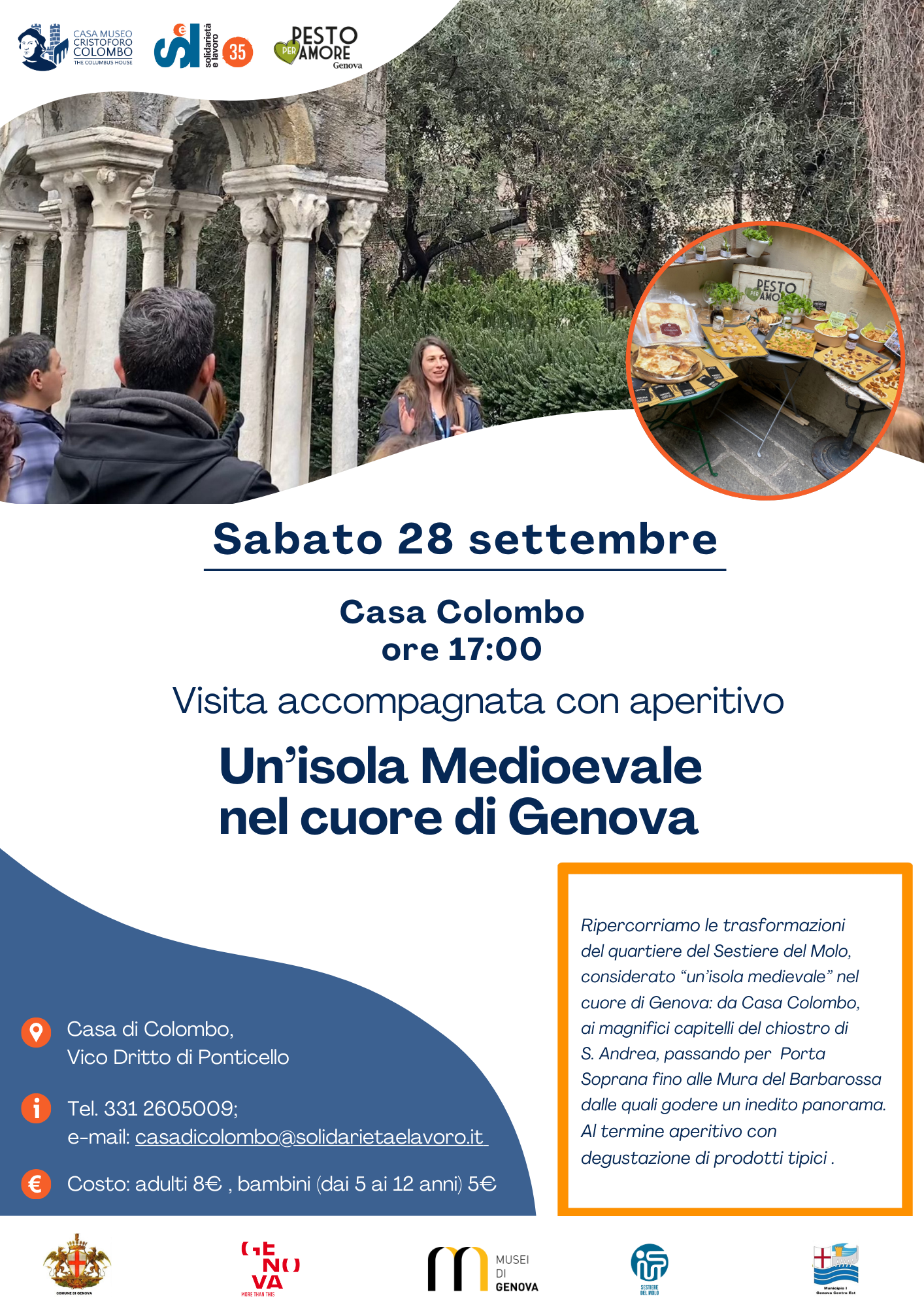 Anche Casa di Colombo aderisce alle GEP – Giornate Europee del Patrimonio, nella giornata di sabato 28 settembre con l’evento dal titolo "Un’isola medioevale nel cuore di Genova", un pomeriggio alla scoperta delle trasformazioni del quartiere del Sestiere del Molo, considerato “un’isola medioevale” nel cuore della Genova moderna, seguita da un aperitivo e degustazione di prodotti tipici liguri.