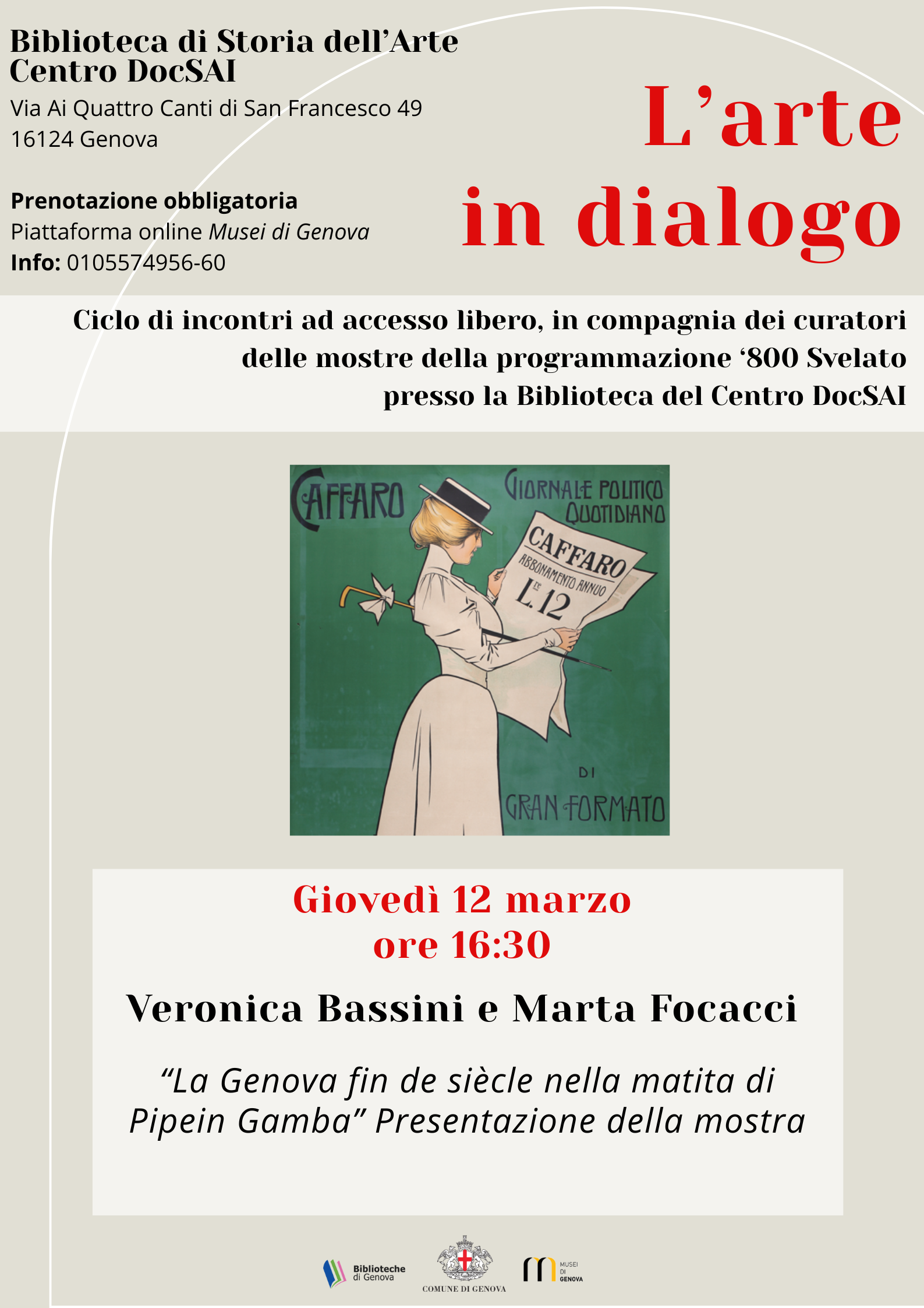 - secondo appuntamento giovedì 12 marzo con Veronica Bassini e Marta Focacci che presentano la mostra "La Genova fien de siècle nella matita di Pipein Gamba".